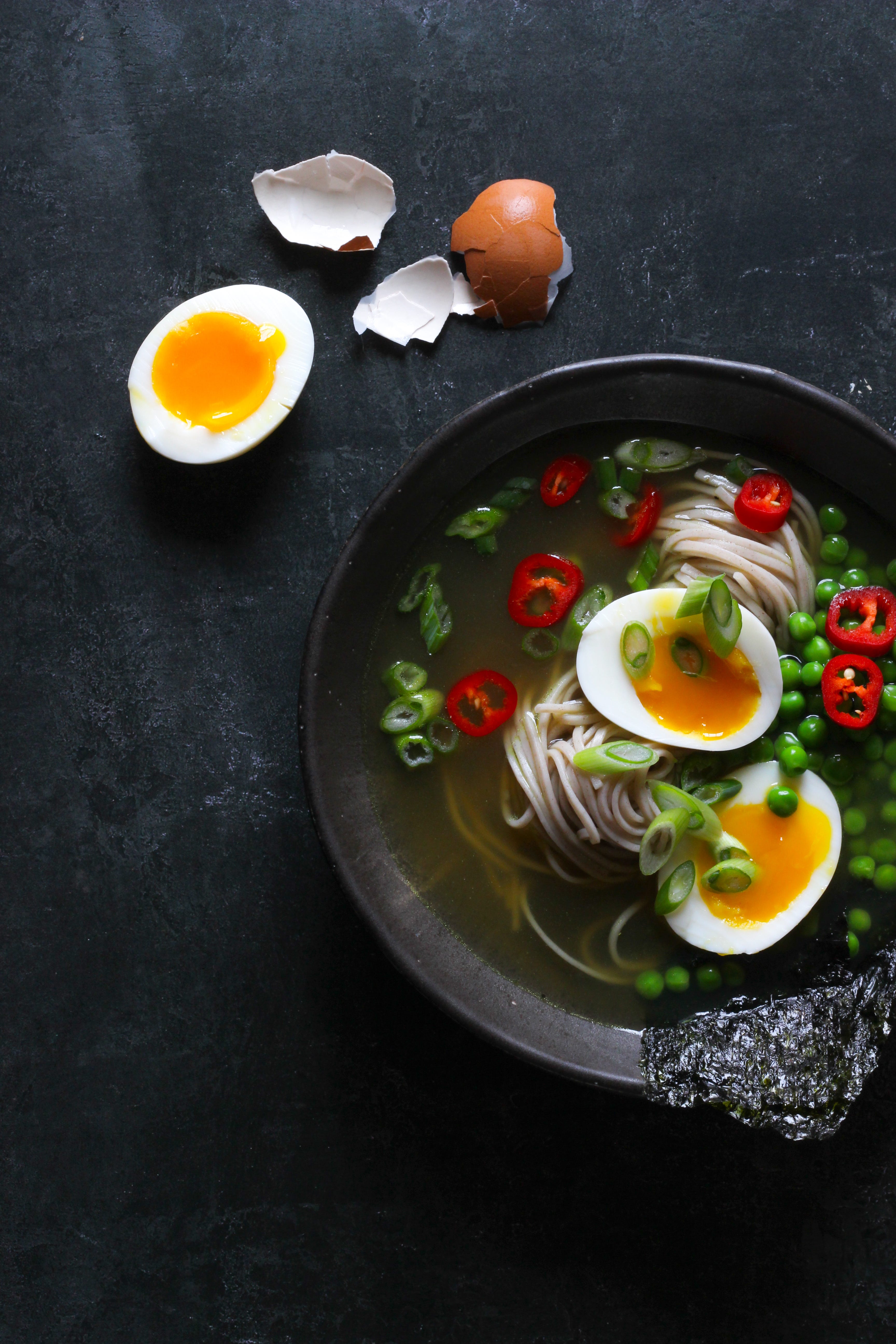 Known as noodle bowls in our house, we use home-made broth to carry as much flavour and nutrition as our motherboard can muster. In the centre of our dinner table we’ll have a juggernaut of leftovers from the fridge, maybe (frozen) petits pois, flaked salmon, chopped scallion, fried mushrooms, our favourite roast veg, some peanut rayu, soft-boiled eggs, strips of nori, lashings of fresh herbs, artichokes jarred in oil, simple sesame seeds, or Spring greens.